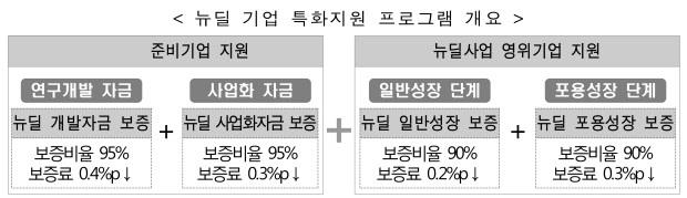 먼저 뉴딜 사업 준비 기업에 대해서는 ‘뉴딜 개발자금 보증’ 및 ‘뉴딜 사업화자금 보증’을 지원한다. 뉴딜 분야 R&D 및 사업화 등에 필요한 자금을 최대 10억원까지 보증지원하고, 보증비율(최대 95%)과 보증료(최대 0.4%포인트 차감)를 우대 적용한다.
