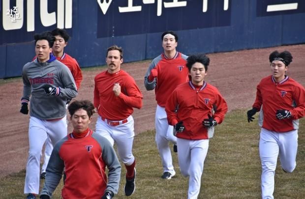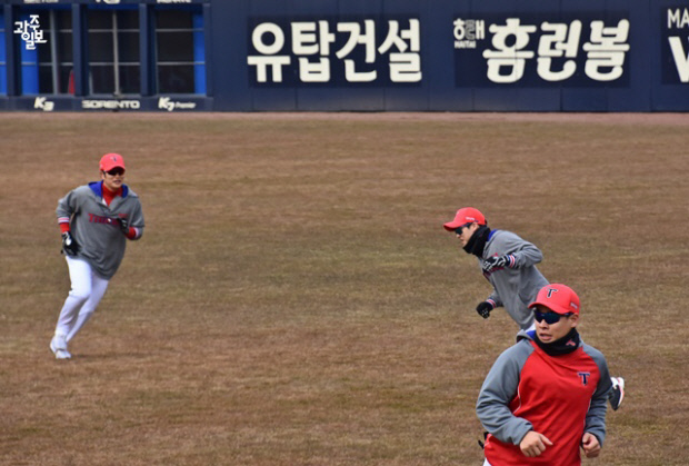 5일 훈련의 시작도 몸풀기. 외야에서 선수들이 몸을 풀면서 하루를 시작합니다.