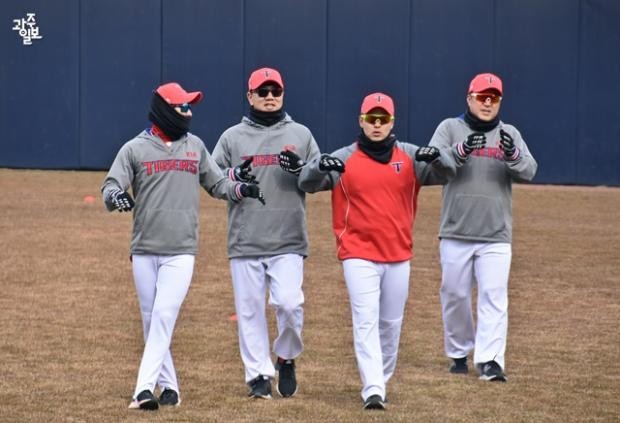 넥워머로 무장을 한 채 야수진들이 가볍게 몸을 풉니다.