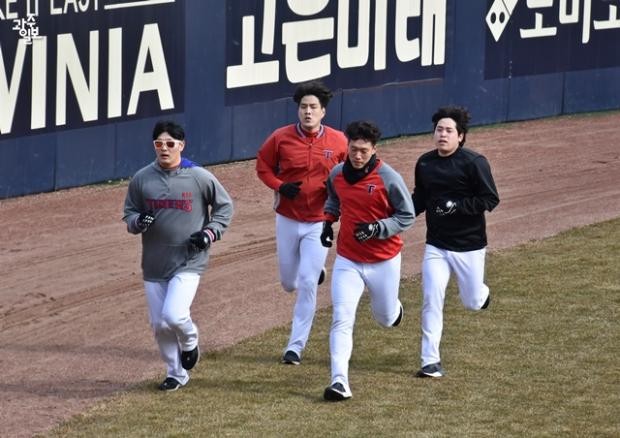 ‘예비역’이 돼 첫 스프링캠프에 참가한 김유신과 2014년 데뷔 후 처음 캠프에 입성한 김재열이 고영창, 박준표와 함께 달립니다.