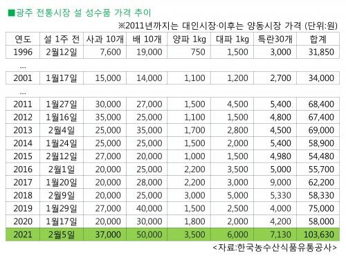 광주일보가 한국농수산식품유통공사 농수산유통정보(KAMIS)에 공시된 지난 5일 기준 광주 양동시장에서 거래된 성수품 5개 품목을 집계한 가격은 10만3630원으로, 1년 전(5만8000원)보다 1.7배(78.7%) 상승했다.