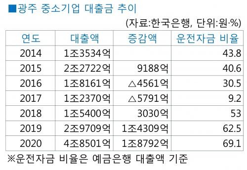 지난해 1~11월 광주 중소기업들은 예금은행에서 3조1884억원, 비은행예금취급기관에서 1조6617억원 등 총 4조8501억원을 빌렸다.