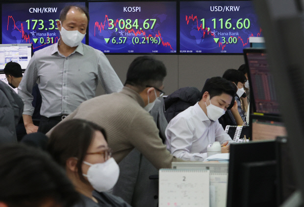 9일 오후 서울 중구 하나은행 본점 딜링룸 전광판에 코스피와 환율이 표시되고 있다. 이날 코스피는 전 거래일보다 6.57포인트(0.21%) 내린 3,084.67에 거래를 마쳤고, 코스닥지수는 전장보다 2.93포인트(0.30%) 내린 957.85로 마감했다./연합뉴스