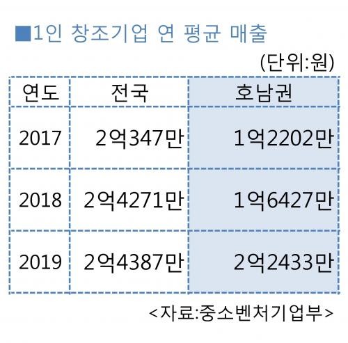 한편 광주·전남·전북을 포함한 호남권 1인 창조기업 평균 매출액은 3년 전만 해도 전국 평균보다 8000만원 넘게 뒤졌지만, 매해 30%대 성장을 거듭하며 격차를 좁혀왔다.