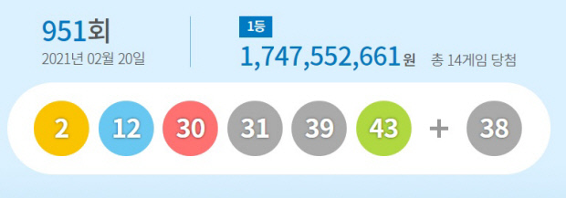 20일 진행된 로또 복권 추첨에서 ‘2, 12, 30, 31, 39, 43’이 1등 번호가 됐다. 14명이 6개의 번호를 모두 맞혔다.