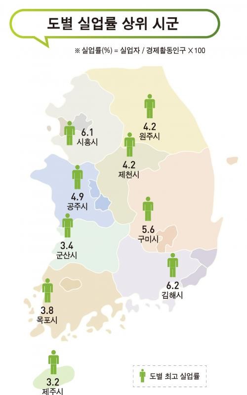 군 단위에서 가장 고용률이 높은 곳은 경북 울릉(84.3%)이었고, 장수(79.6%), 신안(77.3%), 충남 청양(77.0%), 고흥(76.1%)이 뒤를 이었다.