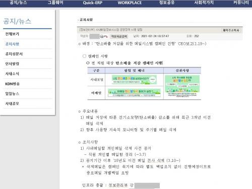 | 한전KDN이 게재한 전 직원 대상 탄소배출 저감 캠페인 홍보 화면.<한전KDN 사내포털 갈무리> |