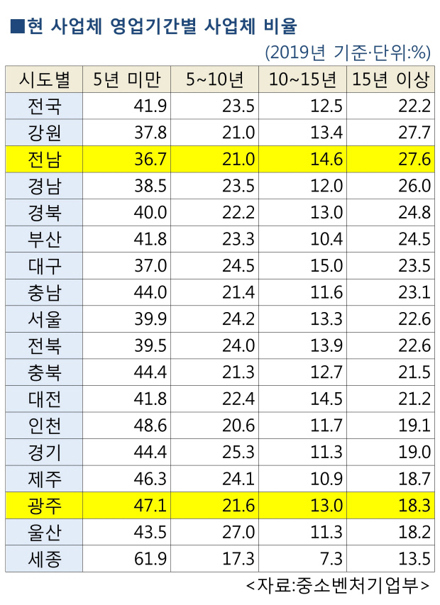 15년 이상 사업체 비율은 전국에서 전남 2위를 차지했고, 광주는 15위에 머물렀다.