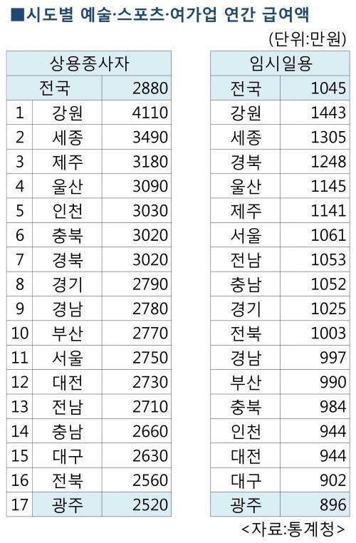 아시아문화중심도시를 내건 광주에서 일하는 예술·체육산업 종사자들이 전국 17개 시·도에서 2년 연속 가장 적은 임금을 받고 있는 것으로 나타났다.