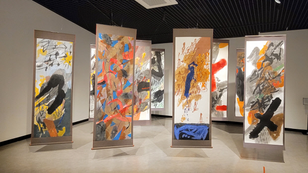 다채로운 색의 향연 속으로 들어서는 기분이다. 전시장에 매달린 족자 형태의 그림 아홉 점은 한 점의 설치미술처럼도 보인다. 추상적 기호들이 자유분방하게 뻗어나가며 리듬감을 부여하고, 종이에 스며들고 어우러진 독특한 번짐과 색채감은 강한 인상을 남기며 한 없는 자유로움을 선사한다.