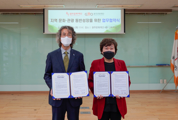 광주문화재단(대표이사 황풍년·왼쪽)과 광주관광재단(대표이사 남성숙)은 지난 16일 지역문화·관광 동반성장을 위한 업무협약(MOU)을 체결했다.<사진>