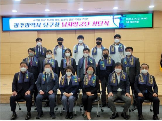 남구청은 17일 남구청 8층 대회의실에서 남자 양궁단 창단식을 개최했다. 김병내 남구청장을 비롯해 김광아 광주시양궁협회장, 이평형 광주시체육회 사무처장 등 50여 명이 창단을 기념하고 있다. <남구청 제공>