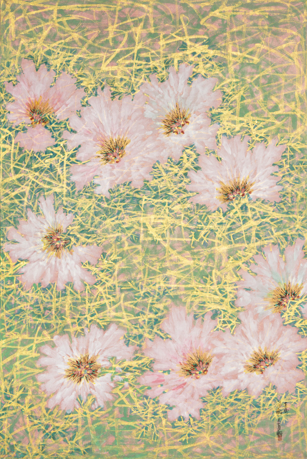 갤러리 입구에서 백매의 소박하고 고즈넉한 자태에 잠시 마음을 빼앗겼다면, 전시장 중앙에 나란히 걸린 3점의 대형 홍매 작품은 화려함에 작은 탄성이 나온다. 자유분방하게 뻗은 가지 위에 놓인 건 꽃이 아니라 하나의 점들이다. 그의 매화 그림에서는 현대적 느낌이 강하게 풍긴다. 붉은빛은 홍차, 노란빛은 치자물, 회색빛은 먹물을 칠해 바탕을 만들고 그 위에 가지와 꽃을 얹었다. 금분(金粉)도 적극적으로 활용해 화려함을 더했다.