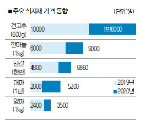 이밖에 건고추(600g)는 작년 1만원에서 1만8000원으로 80%나 뛰었고, 깐마늘(1㎏)도 전년 6000원에서 9000원으로 50% 올랐다. 양파(1㎏) 역시 같은 기간 2400원에서 3500원으로 45.8% 증가했으며, 1판에 4800원이던 달걀(특란 30개)도 4800원에서 6860원으로 42.9% 오른 가격에 거래되고 있다. 또 쌀(20㎏)도 5만1000원에서 11.8% 오른 5만7000원인 것으로 조사됐다.