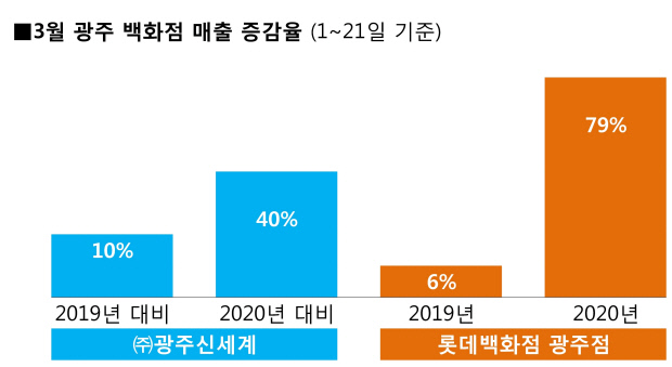 이달 1~21일 ㈜광주신세계 매출은 1년 전보다 40% 증가했고, 같은 기간 롯데백화점 광주점 매출도 79.1% 급증했다.