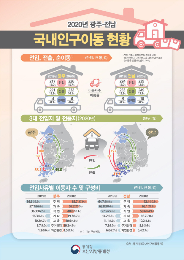 전체 전입자 가운데 광주는 2명 중 1명이 전남에서, 전남은 3명 중 1명이 광주에서 옮겨왔다.
