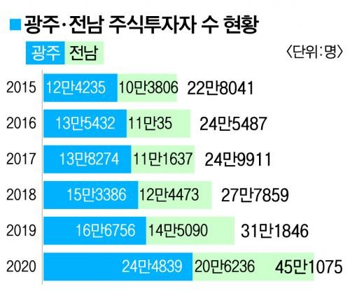 지난해 광주·전남 주식 보유자가 45만명을 넘긴 것으로 나타났다. 지역에서 1년 새 주식 투자자가 14만명이나 늘어나며 ‘동학개미운동’이라 불릴 정도로 뜨거웠던 주식 투자 열기를 반영했다.