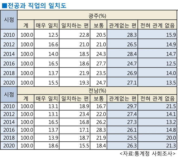 25일 통계청 ‘사회조사’ 결과에 따르면 지난해 광주·전남 지역민을 대상으로 ‘전공과 직업의 일치도’를 묻는 질문에 대해 “전공과 직업이 관계 없다”(전혀 관계 없음 포함)고 답한 평균 비중은 44.1%(광주 40.6%·전남 47.6%)로, 2년 전인 2018년보다 0.9%포인트 증가했다. 지역 취업자 5명 가운데 2명 넘게는 전공과 상관 없는 직업을 택했다는 말이다.