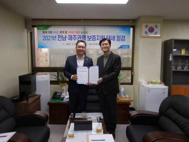 농림수산업자신용보증기금 김석기(왼쪽) 상무는 지난 26일 광주권역보증센터를 찾아 광주를 포함한 6개 센터(순천·나주·전남·해남·제주)와 농림어업인 보증지원을 위한 사업추진 현장경영을 펼쳤다.<농신보 제공>