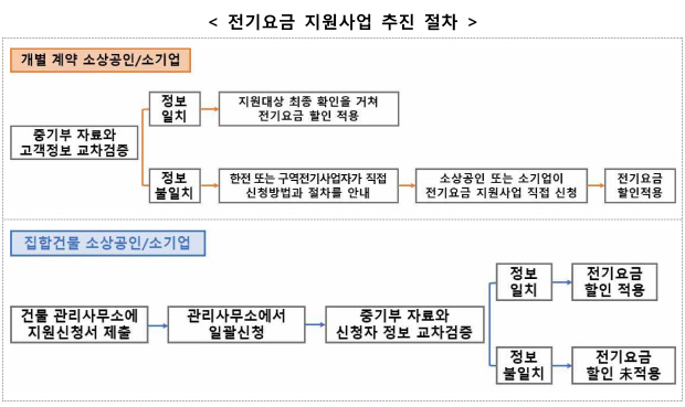 한전 또는 구역전기사업자가 보유한 고객정보와 중기부 정보가 일치하지 않는 경우, 한전 또는 구역전기사업자가 별도로 안내할 예정이다. 한전 사이버지점 또는 구역전기사업자 이메일·팩스를 통해 별도로 신청(4월7일부터 가능)해야 한다. 집합건물 입주 소상공인은 관리사무소를 통해 신청할 수 있다.