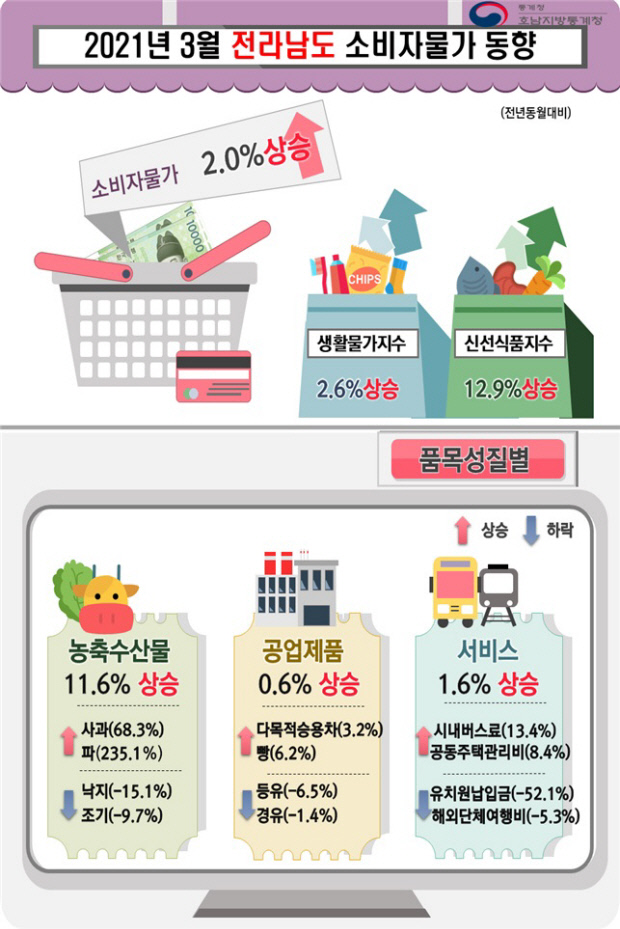 호남지방통계청이 지난 2일 발표한 ‘3월 소비자물가동향’에 따르면 지역 물가는 1년 전보다 광주 1.6%·전남 2.0% 상승했다. 이는 지난 2018년 11월(광주 1.6%·전남 2.1%) 이후 2년 4개월 만에 가장 큰 상승률이다.