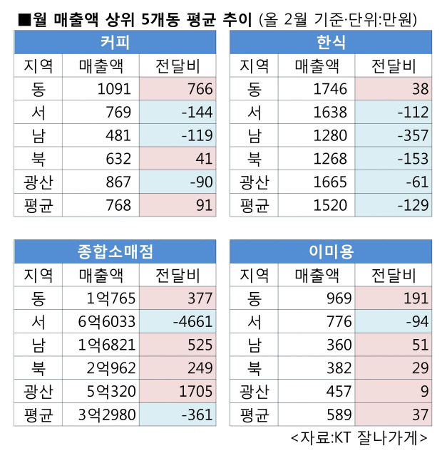 이 같은 내용은 광주일보가 KT의 빅데이터 상권분석 정보서비스인 ‘잘나가게’를 통해 광주지역 카페·한식당·종합소매점·이미용 전문점 매출을 비교한 결과에 담겼다.