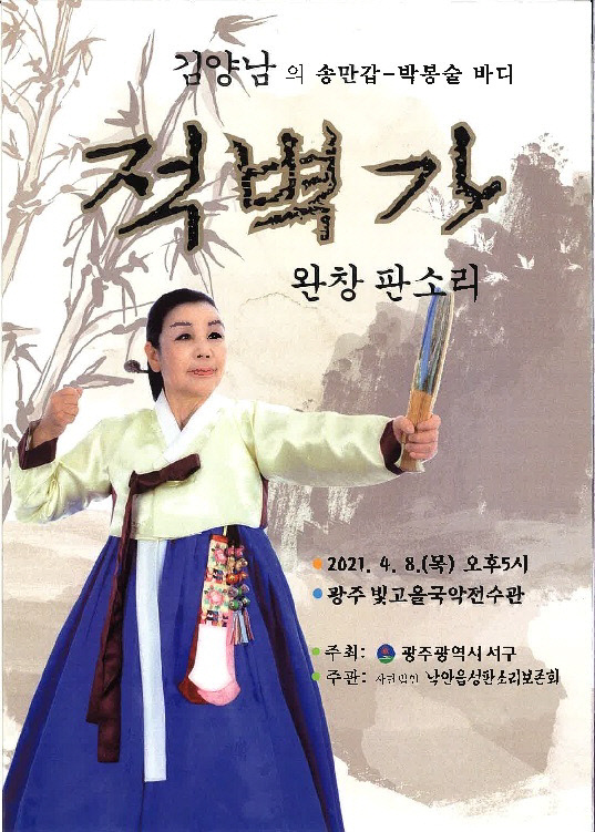 김양남 명창의 동편제 판소리 박봉술제 ‘적벽가’ 완창 공연이 8일 오후 5시 빛고을국악전수관 공연장에서 펼쳐진다.