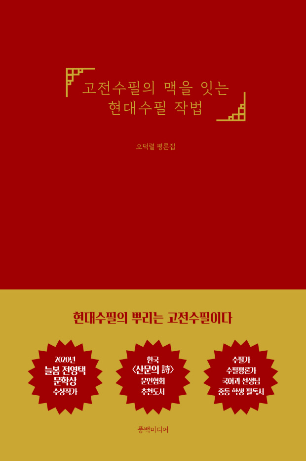 이번에 오 수필가가 펴낸 ‘고전수필의 맥을 잇는 현대수필 작법’(풍백미디어)은 우리의 현대수필이 어떻게 고전수필을 창조적으로 계승, 발전해왔는지를 조명한다.