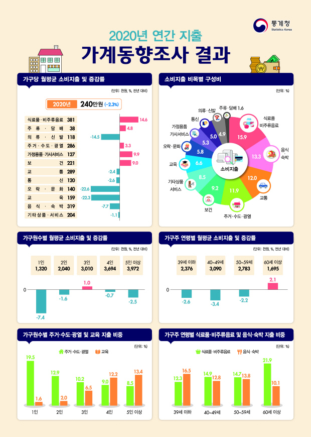 8일 통계청이 발표한 ‘2020년 연간 지출 가계동향조사’ 결과에 따르면 지난해 전국 가구의 월평균 소비지출은 240만원으로 1년 전보다 2.3% 감소했다. 이는 1인 가구를 포함해 통계를 작성하기 시작한 2006년 이후 가장 높은 감소율이다.