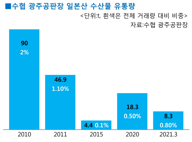 후쿠시마 원전 사고가 있기 직전 해인 지난 2010년 광주공판장에서는 90t 가량의 일본산 수산물이 유통됐지만 지난해에는 그의 5분의 1 수준(-79.7%)인 18.3t 가량이 들어왔다.