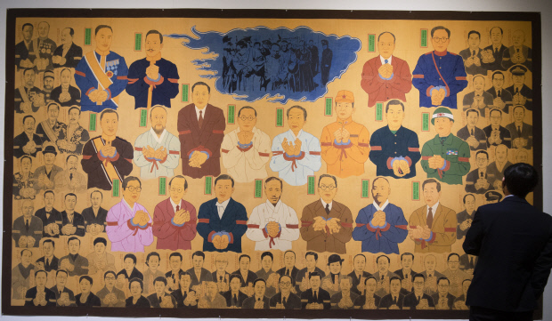 21일 광주비엔날레 등에 따르면 박정희대통령기념재단은 최근 광주비엔날레에 전시중인 이상호의 ‘일제를 빛낸 사람들’(417×245㎝)이 ‘악의적 정치 선전물’이라며 전시 중단을 요구하는 우편물을 발송했다. 이 작품은 민족문제연구소의 친일인명사전에 수록된 인물과 대통령직속 친일반민족행위 진상규명회의 친일반민족행위진상규명 보고서 수록자 등 92명을 포승줄에 묶인 모습으로 표현한 작품으로 박정희 전 대통령의 모습도 포함돼 있다.