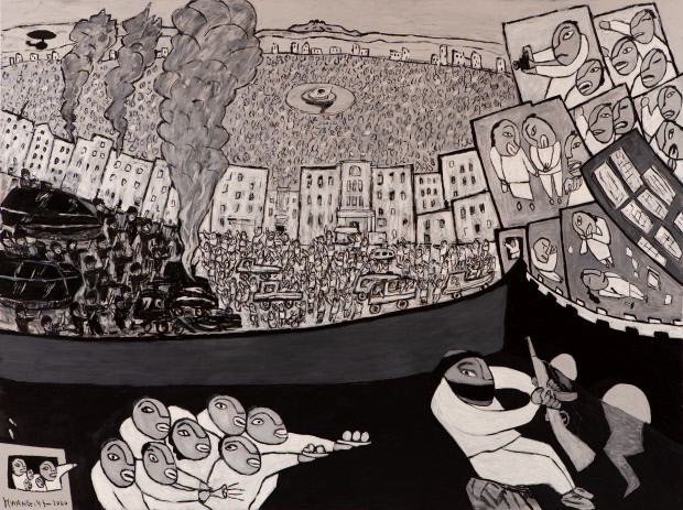 그 중에서도 눈에 띄는 작품은 5·18을 소재로 작업한 ‘5·18 40년의 기억(배고픈다리 밑의 이야기)’이다. 지금까지 오월 관련 작품을 그린 적이 없었던 황 화백은 5·18 40주기였던 지난해 작가로서, 또 광주시민으로서 늘 품고 있었던 오월에 관한 내용을 풀어보자 마음 먹었다. 200호 크기에 검은색과 회색을 주조로 한 작품은 배고픈 다리 인근 아파트에 살며 직접 겪었던 이야기와 도청 분수대, 시위군중 등의 이야기가 함께 담겼다.
