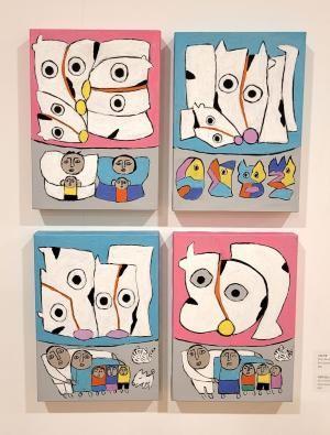 1층 전시실은 화사한 느낌의 소품 위주로 구성했다. 최근작들은 강렬한 느낌의 검은소 대신 흰소가 중심이 됐고, 밝은 색감과 가족들의 모습이 어우러진 작품을 통해 사람들은 어려운 시절을 함께 건너가는 동지애를 느끼게 된다. 흰소가 주인공이 되다보니, 작품을 부각하기 위해 다양한 바탕색을 넣었고, 자연스레 ‘색의 스펙트럼의 향연’이 펼쳐졌다.