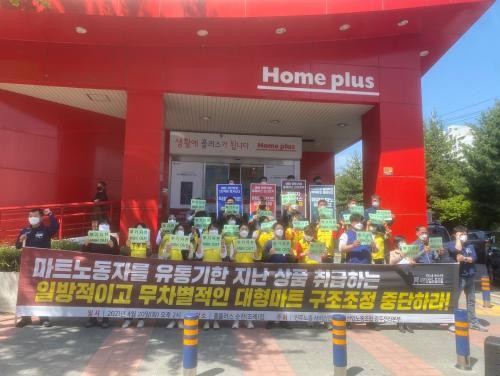 민주노총 마트산업노동조합 광주전라지역본부는 지난 20일 홈플러스 순천점 앞에서 기자회견을 열고 “일방적이고 무차별적인 대형마트 구조조정을 중단하라”고 촉구했다.