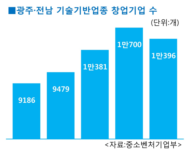 지난해 창업기업 가운데 기술기반 업종이 차지하는 비율은 광주 13.5%(3만9333개 중 5307개), 전남 11.0%(4만6390개 중 5089개)로 나타났다.