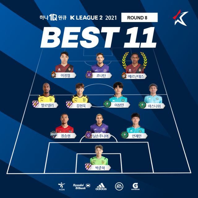 한국프로축구연맹이 27일 K리그2 2021 8라운드 베스트 11을 발표했다. 전남 김현욱이 다시 또 명단에 이름을 올리며 3라운드 연속 선정의 영예를 안았다. 1라운드까지 포함하면 벌써 4번째 선정이다.