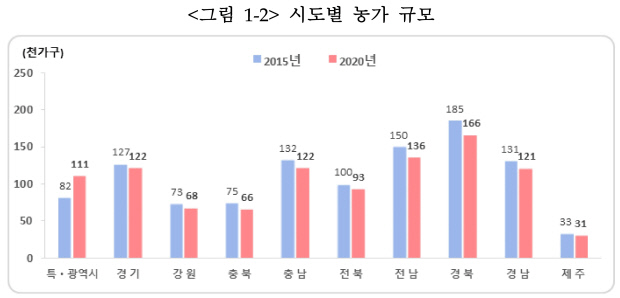 고령 농업인이 많은 전남은 가구원이 한 명 뿐인 농가 수도 많았다. 전남 전체 농가 13만6436가구 가운데 26.8%에 달하는 3만6606가구가 1인 가구였다. 이 비중은 전국에서 가장 높았고, 전국 평균 20%를 훌쩍 넘었다.