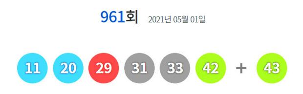 제961회 로또복권 추첨에서 ‘11, 20, 29, 31, 33, 42’가 1등 번호가 됐다. 당첨금은 25억7523만1209원이다.