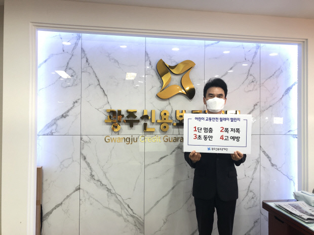 광주신용보증재단은 변정섭 이사장이 3일 ‘어린이 교통안전 챌린지’에 참여하고 있다. 정양수 전남신보 이사장으로부터 지목을 받은 변 이사장은 다음 주자로 나성화 광주경제고용진흥원장을 추천했다.<광주신보 제공>