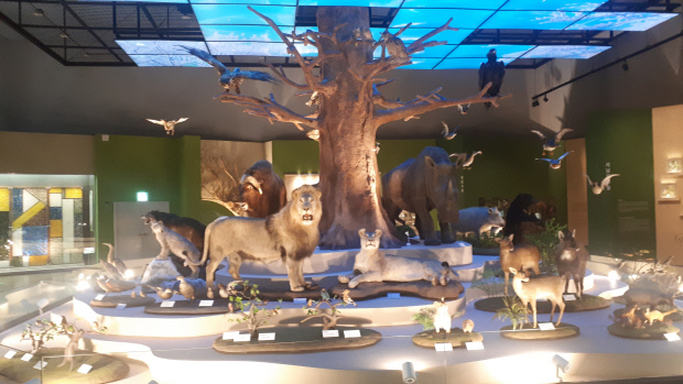 가장 먼저 자연사관 중앙홀로 향한다. 이곳에는 국내 최대 규모의 육식공룡알 둥지 화석이 전시돼 있다. 육식공룡 및 해양파충류, 익룡 등 다양한 중생대 공룡 골격 등도 볼 수 있다. 마치 고생대, 중생대, 신생대 어느 날에 와 있는 듯한 착각이 들만큼 공룡의 골격은 입체적이다. 간간히 음향을 통해 들려오는 공룡 울음소리는 금방이라도 공룡이 튀어나올 것 같은 분위기를 연출한다.