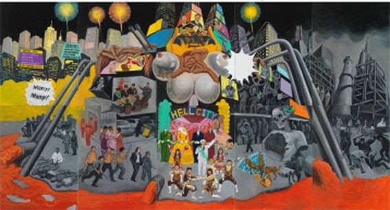 김우성 작가는 자본주의에 대한 날카로운 비판의 시선을 앞세운 작품 ‘헬시티’를 통해 다양한 이야기를 들려준다. 가로폭 5m에 이르는 대작 ‘헬시티’에는 자본주의의 병폐가 고스란히 담겨 있다. “자본주의 시스템이라는 공포의 자판기가 악의 근원”이라고 말하는 김 작가는 ‘헬시티’에서 돈만을 좇는 사회, 자신의 목소리를 내며 투쟁하는 사람들, 부패한 검찰, 제 역할을 못하는 정치인, 일그러진 재벌 등의 모습을 원색의 강렬함과 사실적인 묘사로 표현해 생생함을 전달한다.