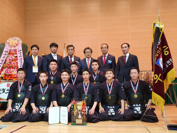 서석고 검도팀. 앞 줄 왼쪽부터 김민수·임우찬·이승준·이종한·조도현·정우진, 두번째 줄 왼쪽부터 임지문·김영운·안태준, 세번째 줄 왼쪽부터 남태윤 코치, 이강산 감독, 최성운 심판장, 김종덕 중고연맹회장, 이전종 지도위원, 윤삼중 중고연맹부회장.