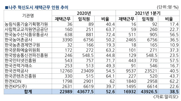 올 1분기(1~3월) 들어서는 혁신도시 13개 기관에서 총 1만6932명이 재택근무를 했다. 전체 임직원(4만3927명) 가운데 38.5% 비중을 차지한다.