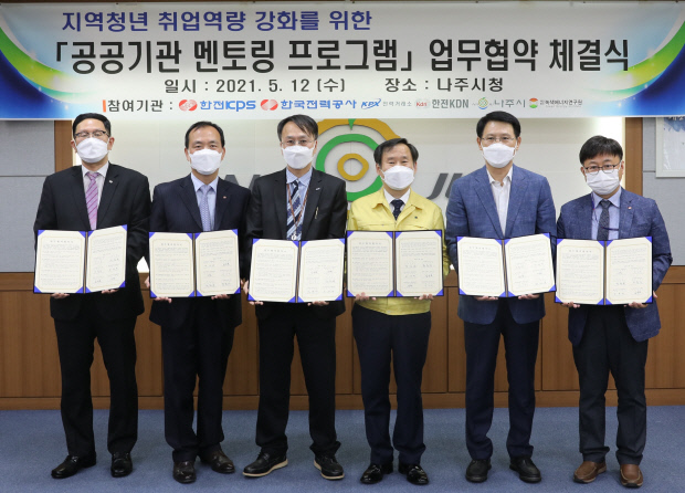 12일 한국전력과 한전KPS, 한전KDN, 전력거래소 등 나주 혁신도시 전력그룹사 4개사가 나주시·녹색에너지연구원과 지역 청년을 대상으로 ‘공공기관 멘토링 프로그램’을 펼치기 위한 업무협약을 맺고 있다. 이 프로그램은 한전KPS 일자리창출 시민참여단이 제안해 마련됐다.<한전KPS 제공>