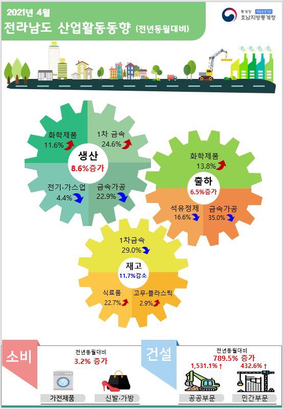 전남 광공업 가운데서는 지역 주력 업종인 화학제품(11.6%)과 1차금속(24.6%) 생산이 증가했다.
