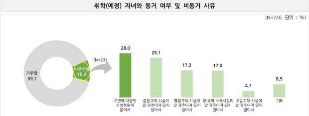 자녀와 따로 사는 이유를 묻자 ‘주변에 다양한 사설학원이 없어서’(28.0%)를 가장 많이 꼽았다. ▲중·고교가 잘 갖춰져 있지 않아서(25.1%) ▲도서관·청소년 수련시설 등 평생교육 시설이 잘 갖춰지지 않아서(17.2%) ▲영·유아 보육시설이 잘 갖춰져 있지 않아서(17.0%) 등 이유도 있었다.
