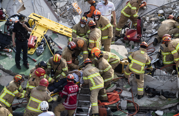 | 119구조대원들이 무너진 건물 잔해 속에서 구조 작업을 벌이고 있다. /최현배 기자 choi@kwangju.co.kr |