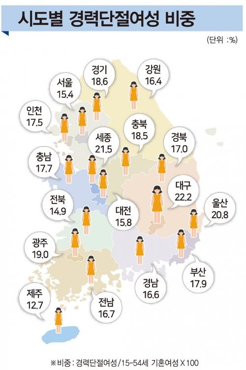 전남은 11번째를 차지했고, 경력단절여성 비중이 가장 낮은 곳은 제주(12.4%)였다.