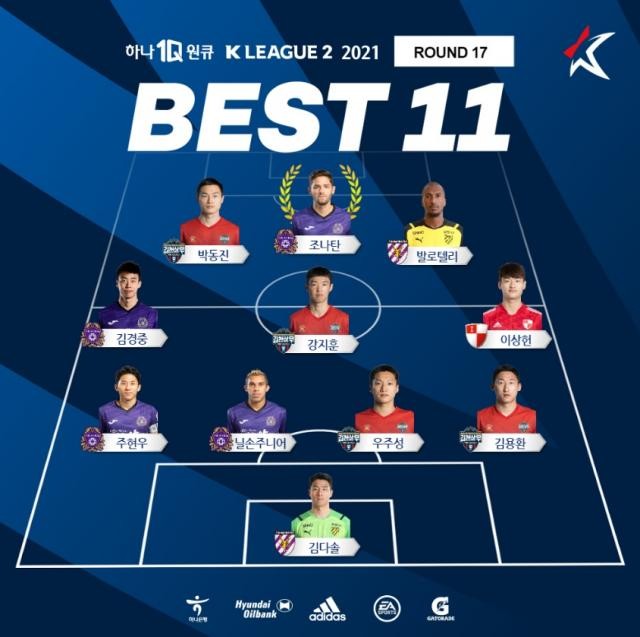 한국프로축구연맹이 22일 ‘하나원큐 K리그2 2021’ 17라운드 베스트 11을 발표했다.
