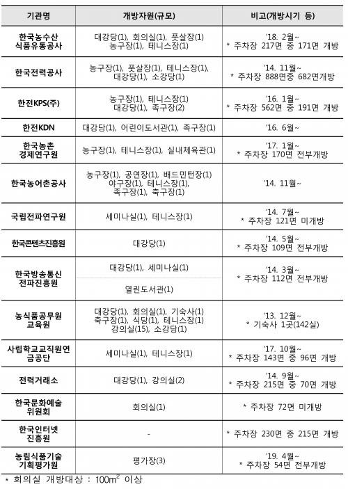 한전KDN은 어린이도서관과 대강당, 족구장이 개방됐다. 농식품공무원교육원에서는 142실을 갖춘 기숙사와 식당을 쓸 수 있다.